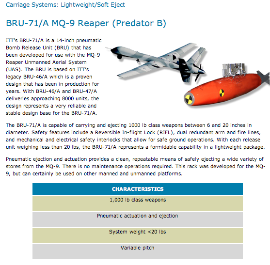 ITT, according to its web site, derives 58 percent of its income, over $6.3 billion in 2009, from its military contracts. The company produces a variety of military electronic gear, such as jammers for signals used to set off land mines, communications equipment, night vision equipment and munitions release mechanisms for aircraft, including bomb releases for 1,000 lb. bombs carried by Predator drones.