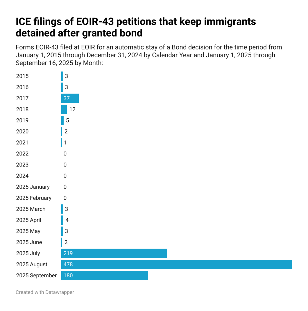 ICE had rarely resorted to this “automatic stay” of a judge’s bond decision in the past — just three times in the five years from 2020 to 2024. But, according to data released to Documented in response to a Freedom of Information Act (FOIA) request, that changed drastically this summer. In less than 12 weeks, from July 1 to Sept. 16, ICE filed to block a judge’s order granting release 877 times across the country, records from the Justice Department’s Executive Office for Immigration Review (EOIR) show.