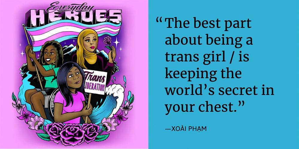I am proud to be one of 10 trans artists of color who created artwork for this year’s Trans Day of Resilience art project by Forward Together, a national organization led by women of color, whose mission is to unite communities to win rights, recognition and resources for all families. The Trans Day of Resilience art project is an extension of the annual Trans Day of Remembrance. This art project calls on us to grieve our lost ones and to celebrate our resilience together. Below, we highlight these artists’ work. Five poets and visual artists were paired together to work on art that captures what trans resilience means to them.