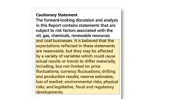 The UK-listed Shell Transport and Trading Company added a cautionary statement to its annual report which identified “environmental risks, fiscal and regulatory developments” as variables which could affect the risk factors associated with “the oil, gas, chemicals, renewable resources, and coal businesses”.