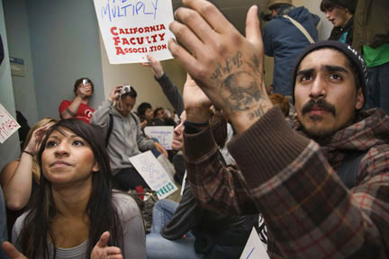Hayward, CA – Students and faculty at California State University, East Bay, marched to the administration building on the campus and then occupied the building in protest. Organized by Students for a Quality Education and the California Faculty Association, the civil disobedience protested budget cuts and fee increases for students, and cutbacks on staff and benefits, while administrators' salaries are increased.