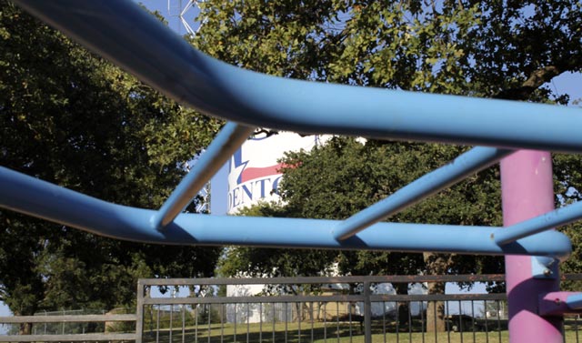 Today, the park is quieter except for the faint clanking of metal ringing out from the infrastructure still at the site. The sound carries on the wind over the top of the remaining barrier. The city’s water tower, emblazoned with the city’s Texas flag logo, looms above the landscape. Before the gas well, and even before George McKenna donated $8,000 for the park’s construction in 1964, longhorn cattle grazed the fields at J. Newton Rayzor’s ranch. Much has changed since then.