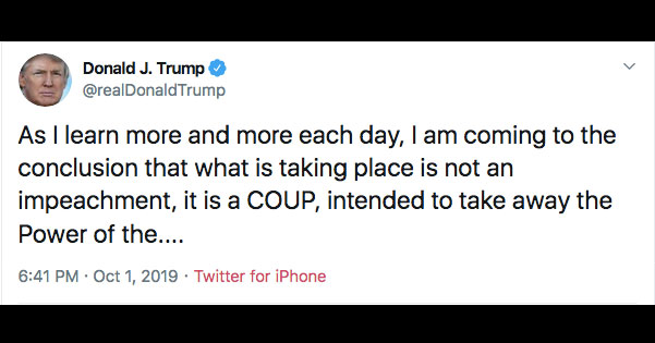 “As I learn more and more each day,” the president tweeted, “I am coming to the conclusion that what is taking place is not an impeachment, it is a COUP, intended to take away the Power of the People, their VOTE, their Freedoms, their Second Amendment, Religion, Military, Border Wall, and their God-given rights as a Citizen of The United States of America!”
