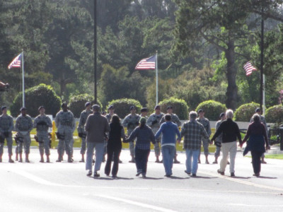 PATRICK O’NEILL: Well, oddly enough, even though that base has been there for 30 years — I mean, it was loaded with the nuclear warheads back in the late ’80s. There had been a huge action at Cape Canaveral in 1987, when the bombs were being flight tested. And, you know, Dr. Spock — it was 5,000 people went down there to oppose the flight testing of the D5 missiles at that time. But even after that 30 years, the Trident base had very little resistance from the community down there, not like out in Washington state where the other Trident base is, in Kitsap, where there’s always been a lot of ongoing resistance. There just had never really been much happening here, and we thought it was a good place to call attention to, in light of the horrific nature of the Trident system. And we were hoping, too, that this would somehow show our solidarity with the triplets that Martin Luther King spoke of. We wanted to make the connections, on the anniversary of King’s assassination, to militarism, consumerism and racism. So, we we wanted to just, I guess, what we call, educate the base.